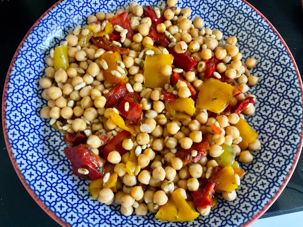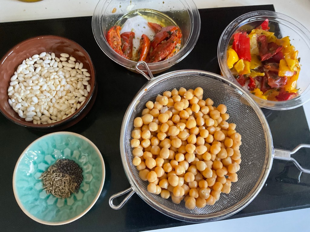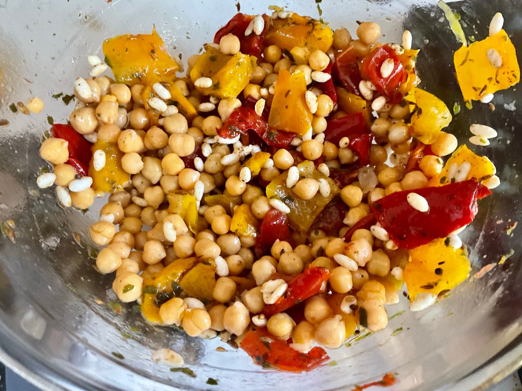 - Add the tomatoes, peppers, zaatar and salt and pepper to the chickpeas. Pour in the dressing and give it a good toss so everything is combined. Next add the puffed rice and give it a light fold through so they keep their texture. Serve and enjoy.