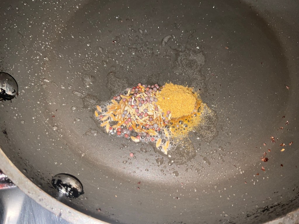 - Add the chickpeas into a bowl. Heat a splash of oil in a frying pan, add the cumin, mustard seeds and ground cumin. Fry for about 40 sec until you hear the seeds start to pop. Tip into the chickpeas.