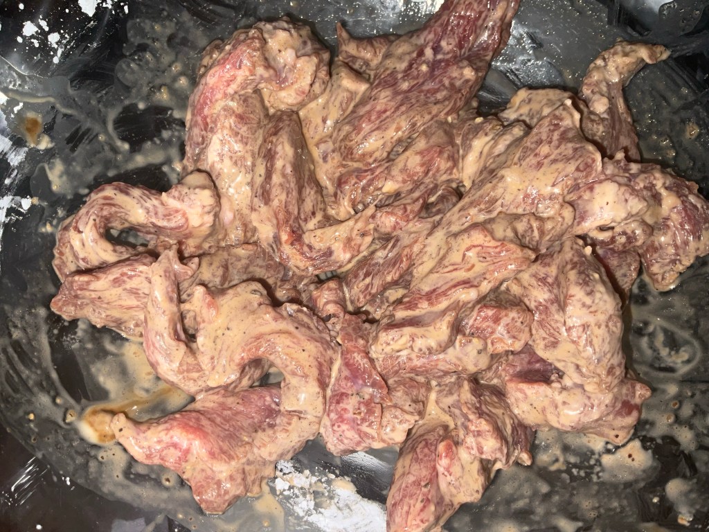 - In a bowl add the marinade ingredients and give it a good mix. Add the steak and massage and mix so all the steak is coated. Put in the fridge for at least 30 minutes.