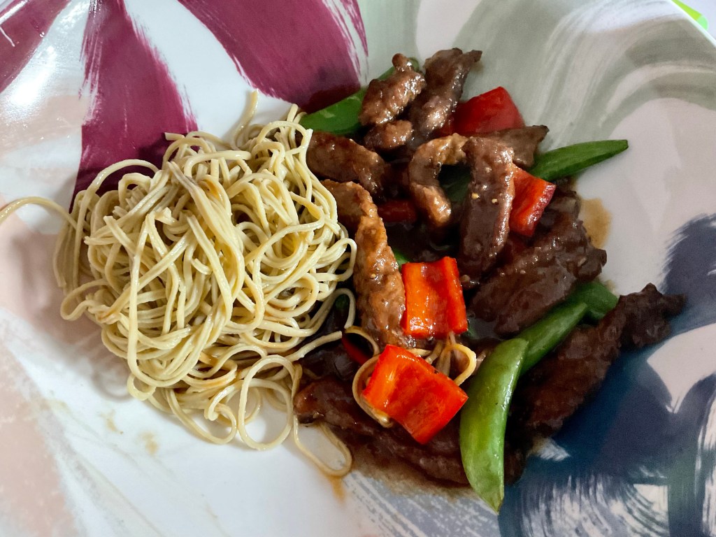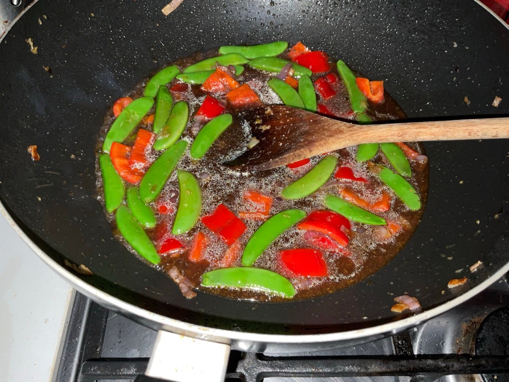 - Add the sugar snap peas, beef and sauce. It will bubble so reduce to a simmer and cook for a couple of minutes. The corn flour on the beef should thicken the sauce, if it doesn’t just add a teaspoon of corn flour with a dash of water and add to the sauce. Serve and enjoy 😊