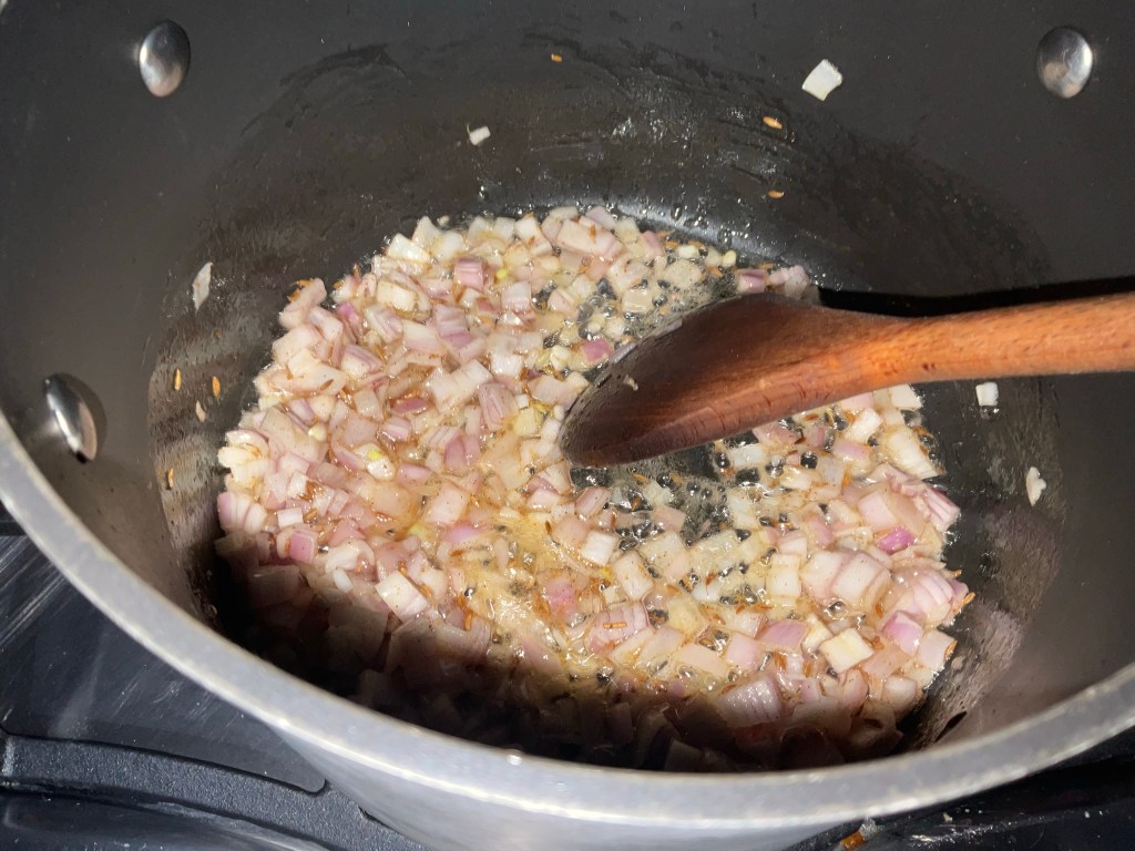 - In a large saucepan with a lid, heat the oil and butter until hot. Add the cumin seeds and fry for about a minute or until you hear them start to pop. Add the shallots and cook for 5 minutes until they have softened and are just starting to colour. Add the ginger and garlic and cook for another minute.