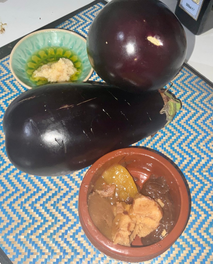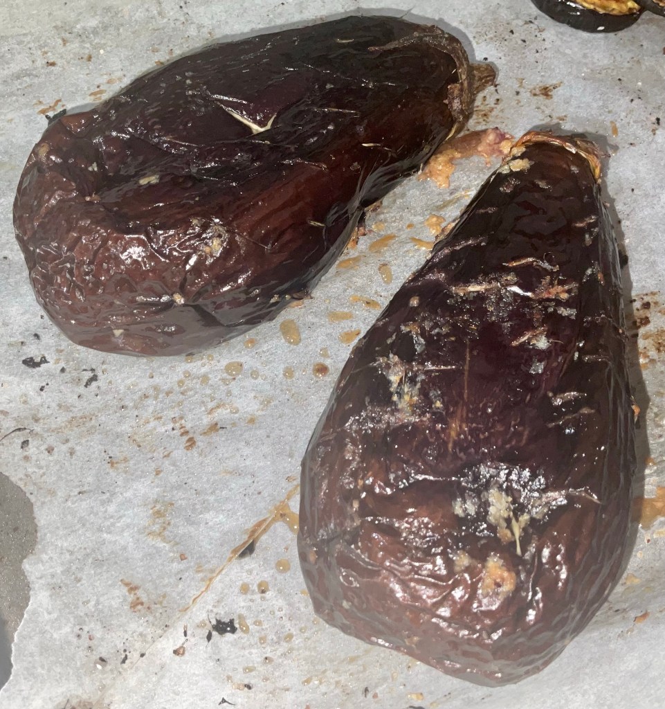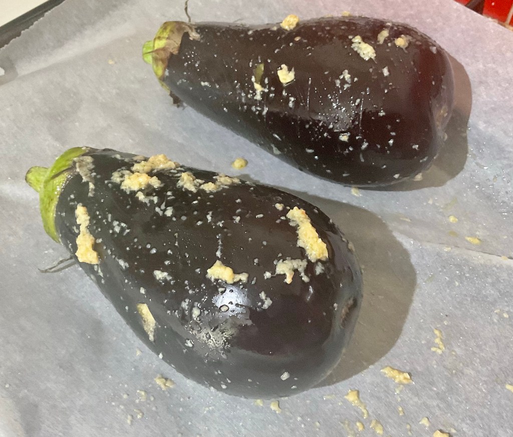 - Preheat oven to 180 degrees fan. Insert a sharp knife all over the aubergine, so you have slits to rub in the pastes.
