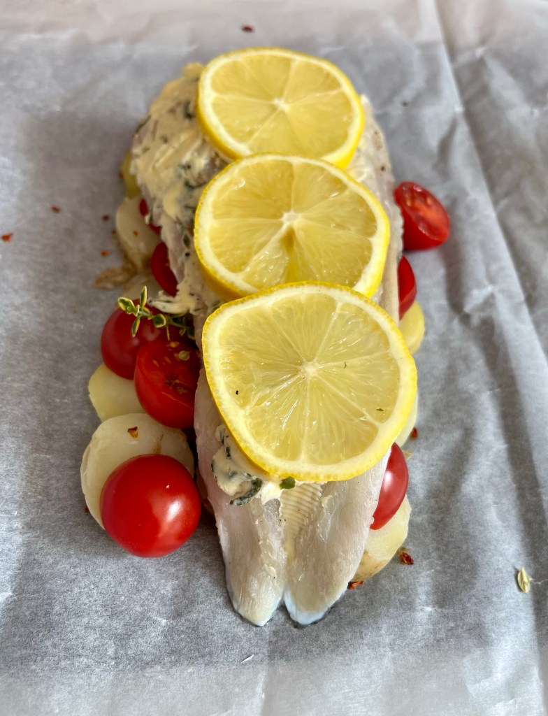 When I first started cooking en papillote was one the first fish dishes I tried as I felt comfortable with it as it was in a bag and cooked itself in the oven. It is so tasty and you can anything under the fish, fennel, vegetables rice etc. I am so glad I did it again as I really enjoyed it. I love the name for one as it sounds posh! The other great thing is it is self saucing particularly from the juice from your tomatoes. I think next time im going to go down the Asian root.