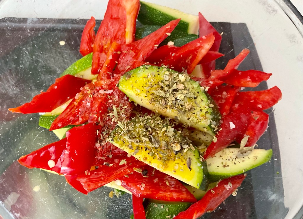 - In a bowl add the courgettes, peppers, 1 tsp of olive oil, oregano and thyme. Give it a good toss to combine. Put into the air fryer, still on 200 degrees and cook for 15 mins, giving them a shake half way through.