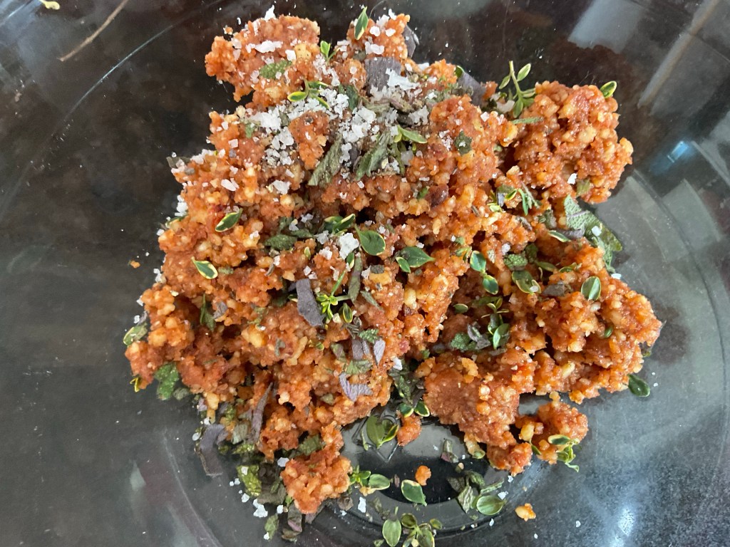 - In a food processor add the walnuts, sage, thyme and sun dried tomatoes. Blitz but not too much as you want some texture. Tip in a bowl and stir in the bread crumbs and parmesan.