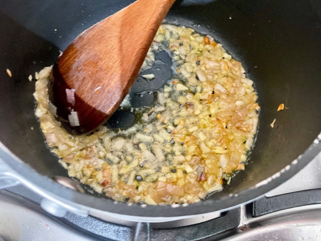 - In a saucepan add a drizzle of olive oil. Add the shallots and cook for about 4 minutes or until translucent and soft. Add the garlic and cook for a further minute.
