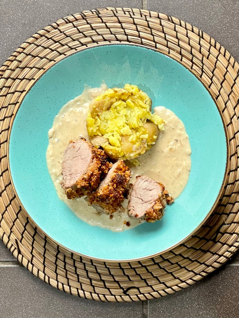 This dish was so delicious and would be perfect for a dinner party. All the flavours work really well. As you are crusting the pork it kept it really moist. I’d usually do a mushroom sauce but fancied something different. I had some cream cheese in the fridge and thought it would just be the same as using cream and it was!
