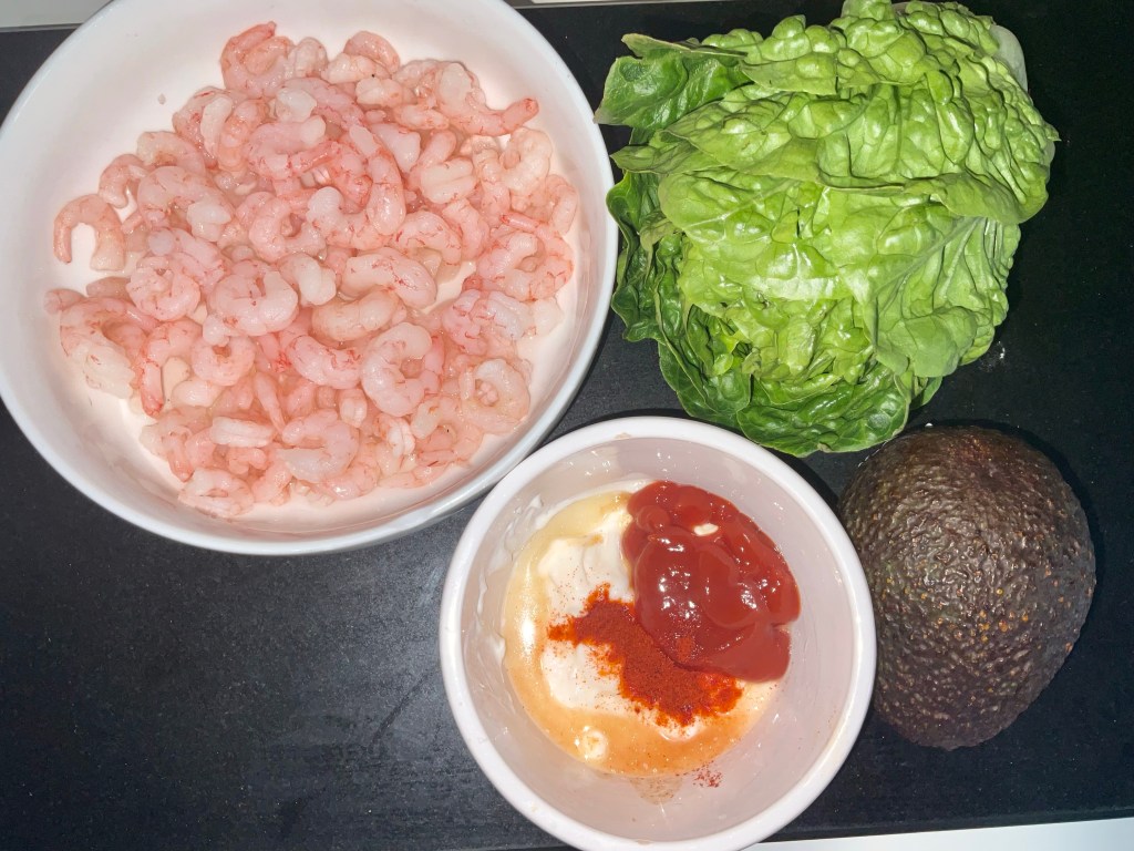 - Add the chopped lettuce between 2 bowls, add the avocado and spoon over the prawns tap on some cayenne pepper. Serve with a lemon wedge and sprinkle of chives. Enjoy 😊