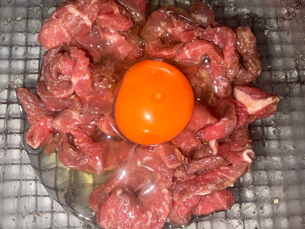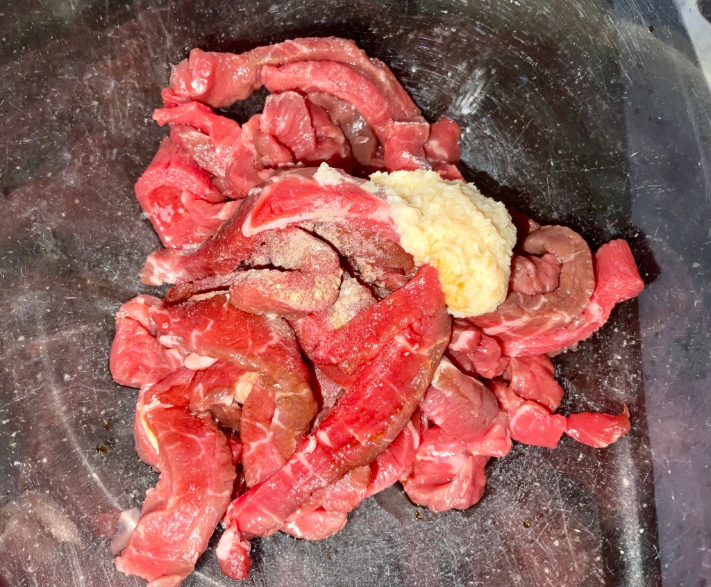 - Put the beef in a bowl and crack in the egg. Use a fork to mix the egg so it coats all of the beef. Next add the rest of the marinade ingredients, again stir to combine. Cover and place in the fridge for at least 30 minutes but the longer the better.