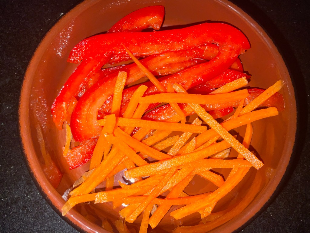 - In a frying pan, add a drizzle of oil and stirfry the pepper and carrot for a minute. Pour in the sauce give it a good stir once bubbling turn off the heat and add in the cooked beef strips. Serve immediately.