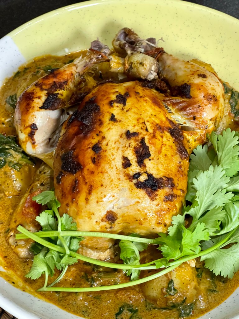 Wow this was a show stopper! I managed to pick up a reduced small chicken in the supermarket and thought I need to do a one pot so the chicken is moist. I chose to go down the Indian route. I made my own tikka paste and it was a game changer though I think jarred would be fine. The chicken was so tender and the skin was so good with the tikka flavour. As its summer baby potatoes are really good, I crushed them in the gravy. I had leftover chicken which I chucked in a salad. Yumyum yum!