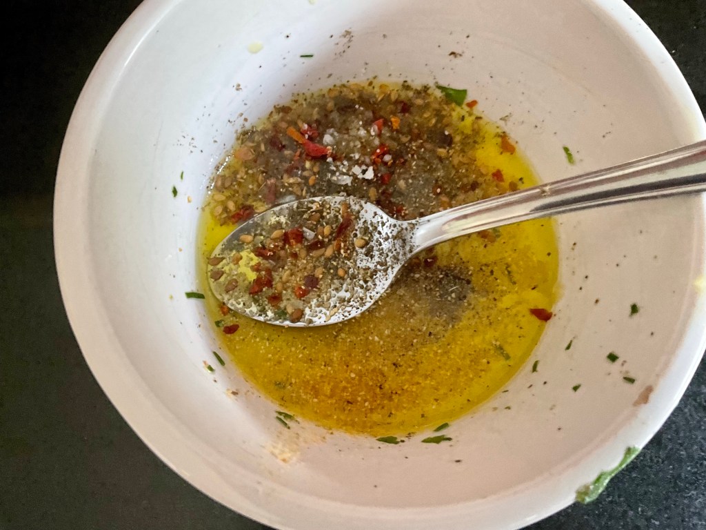 - In a bowl mix the olive oil, zaatar, pepper flakes and salt. Give it a whisk to combine.