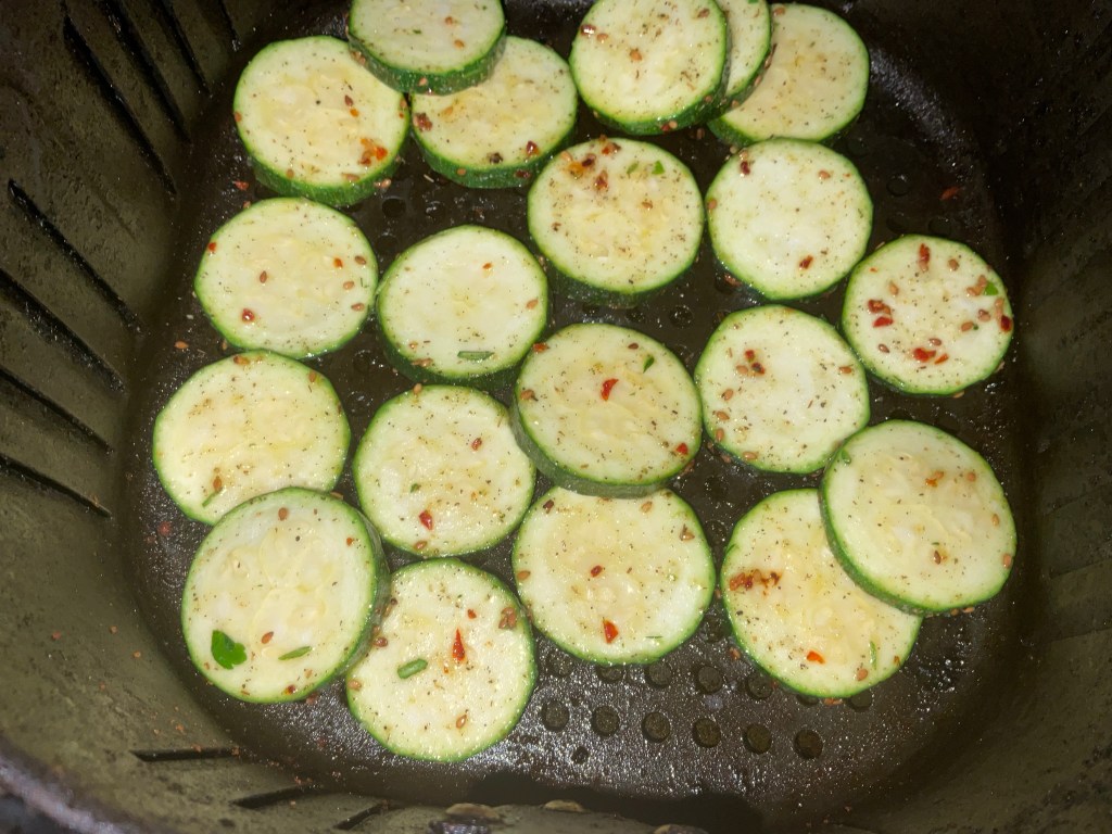 - Heat air fryer to 200 degrees. Add the courgettes to the zaatar mix and toss to coat them.