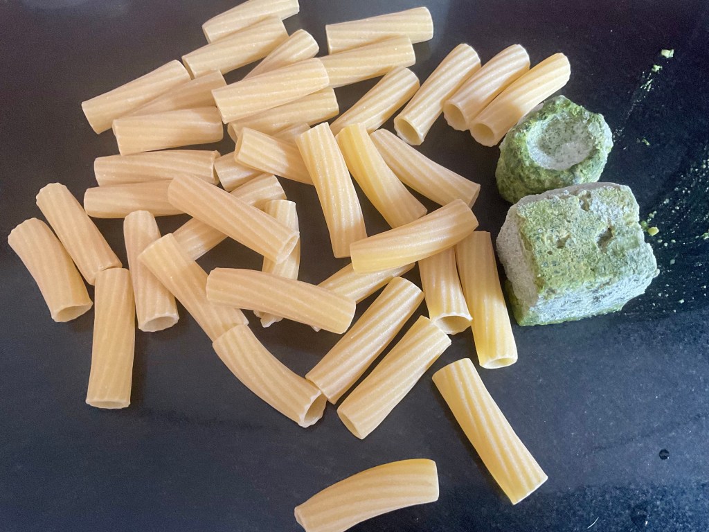 - In a bowl add the cooked pasta and pesto, give it a good mix so the pasta gets fully coated.