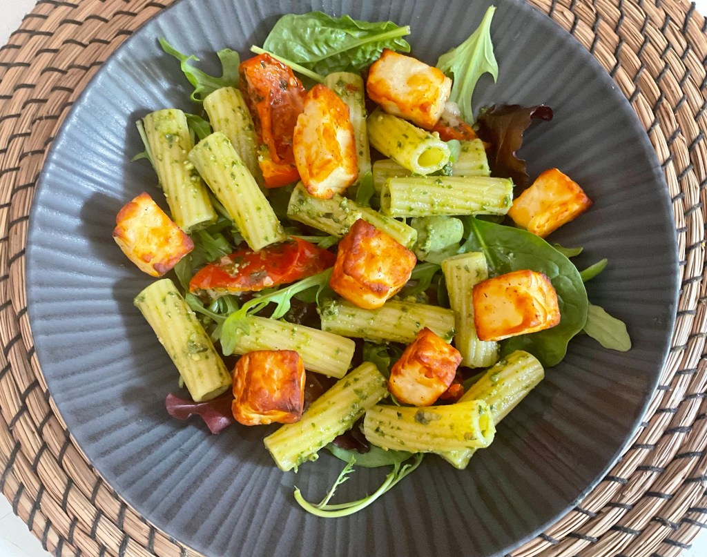- Assemble the salad by adding the salad leaves to a serving dish, spoon over the pasta, tuck in the tomatoes and finish off with the cubed halloumi. Enjoy 😊