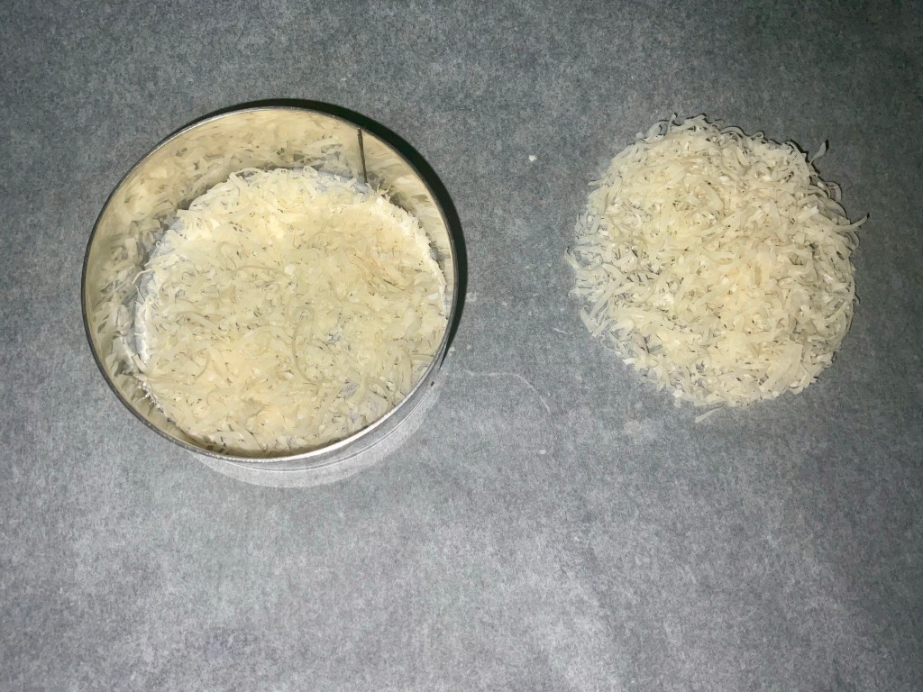 - If you are making the parmesan crisps do this step first as they need to totally cool down before serving. Heat the grill to highest setting. On a grease lined baking tray. Sprinkle the parmesan in a thin layer (I used a cooking ring) and repeat until you’ve used all of your parmesan up. Pop under the grill until bubbling and a very slight browning. Mine only took a couple of times. Remove and then leave on the baking until cooled. Once cooled you can serve them.