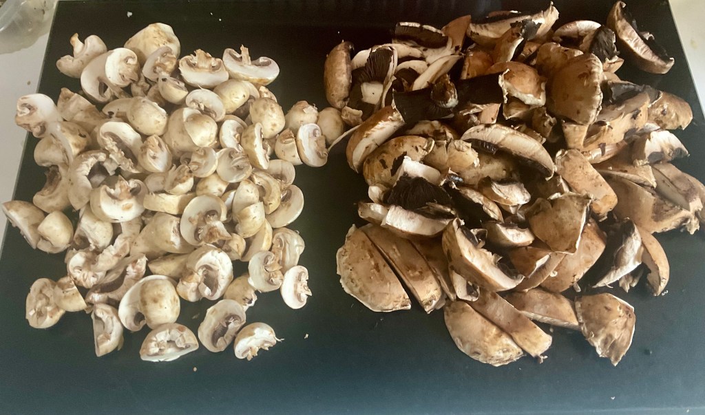 - Slice the button mushrooms in half. Next slice the chestnut mushrooms (mine were in 4). Chop the portobello mushrooms so they are near the same size and the button and chestnut.