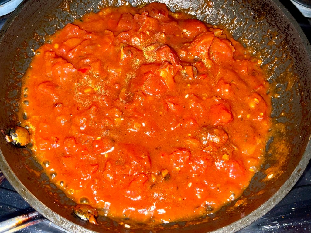 - Add in the tinned tomatoes and simmer for 5 minutes. Add the red pepper flakes, taste and season to your taste.
