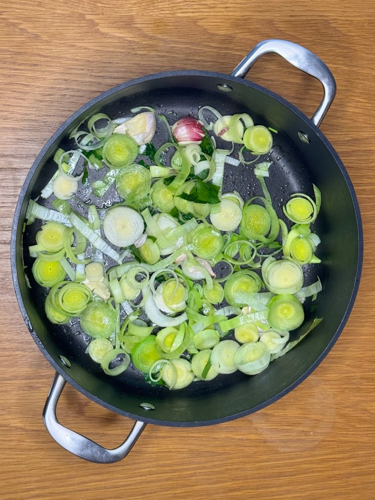 - In an oven proof pan melt 2 tbsp of butter. Add the chopped leeks and smashed garlic cloves. Sweat down until soft on a medium heat, about 5 minutes.