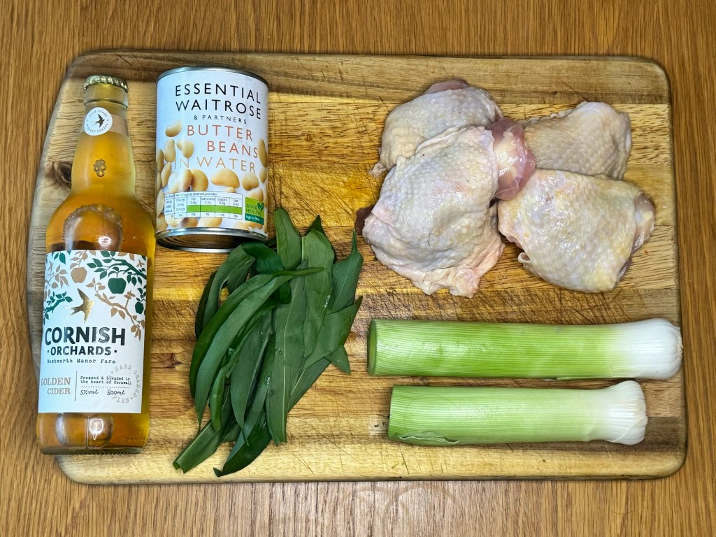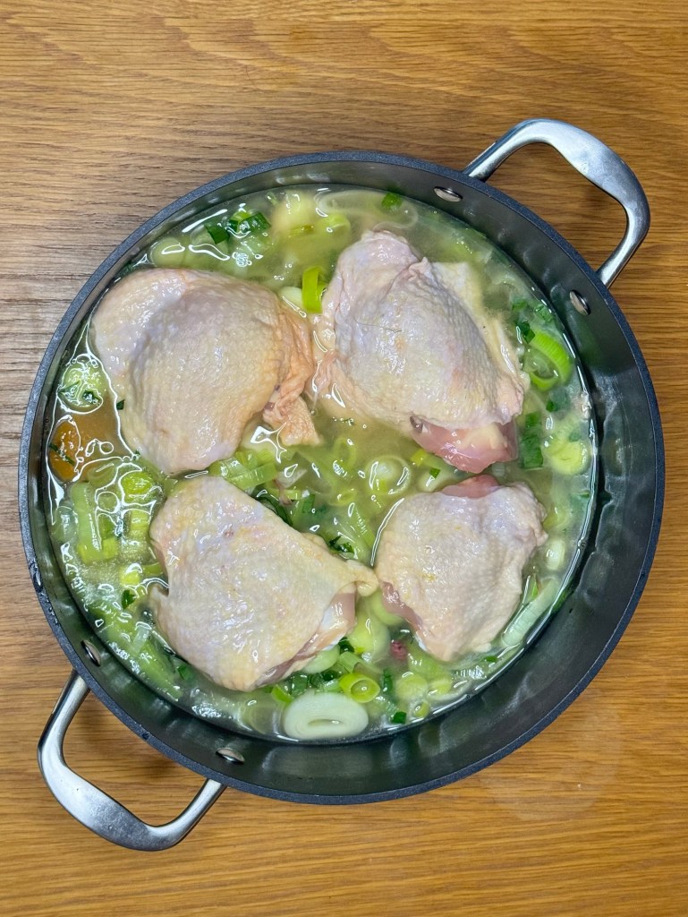 - Add the chicken stock, wild garlic and nestle the chicken thighs in the sauce making sure the skin isn’t submerged. Sprinkle each chicken thigh with a pinch of sea salt. Pop in the oven uncovered for about an hour or until the skin is crispy.