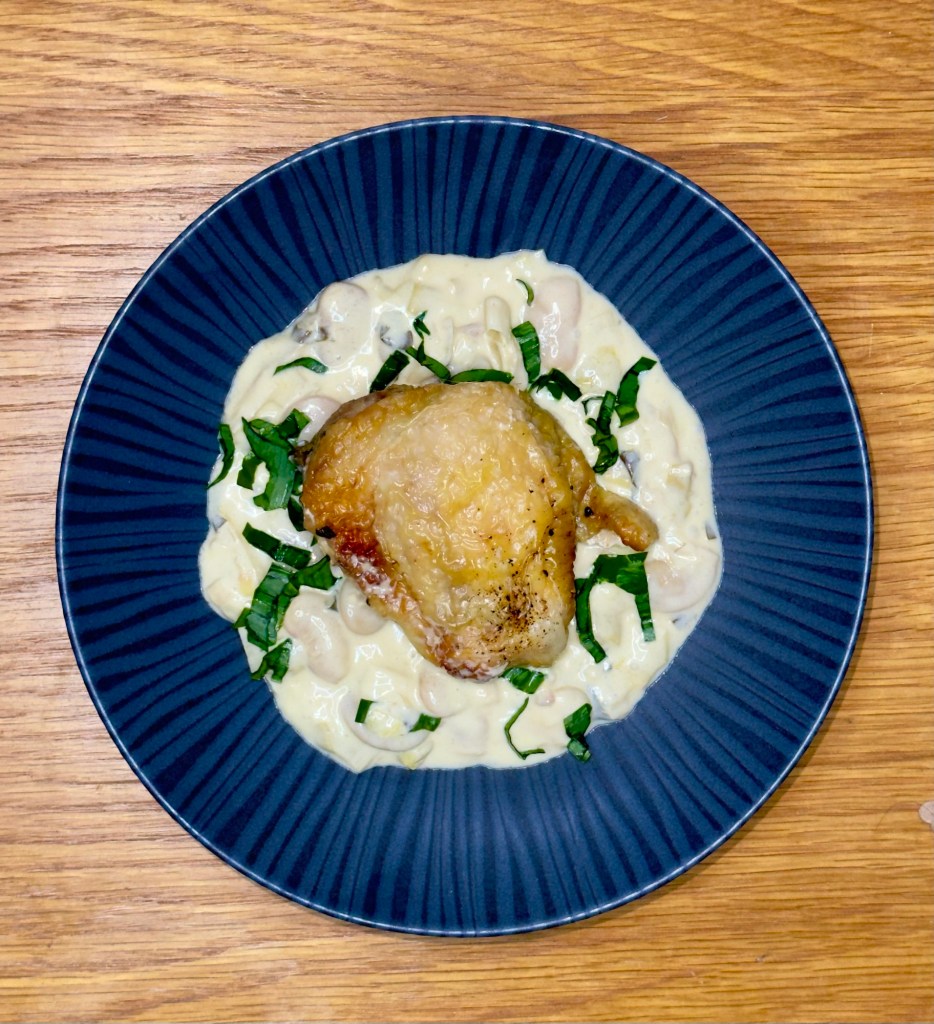 - Put the pan back on the stove. Add the butter beans, cream, pepper and salt if needed (my stock seasoned the sauce) so no salt needed) Bring to a slight boil. Turn the heat down to a simmer add the thighs back into the pan and warm through for a couple of minutes. Serve with some of the reserved garlic leaves and enjoy!