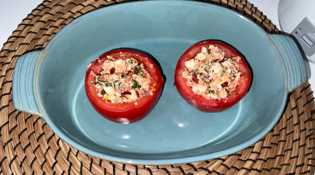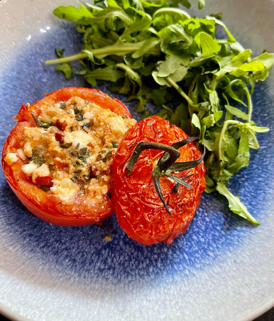 - Fill the tomatoes with the mixture and place the lids back on. Pop in the oven and bake for 25 mins. Serve with salad or your chosen side. Enjoy J