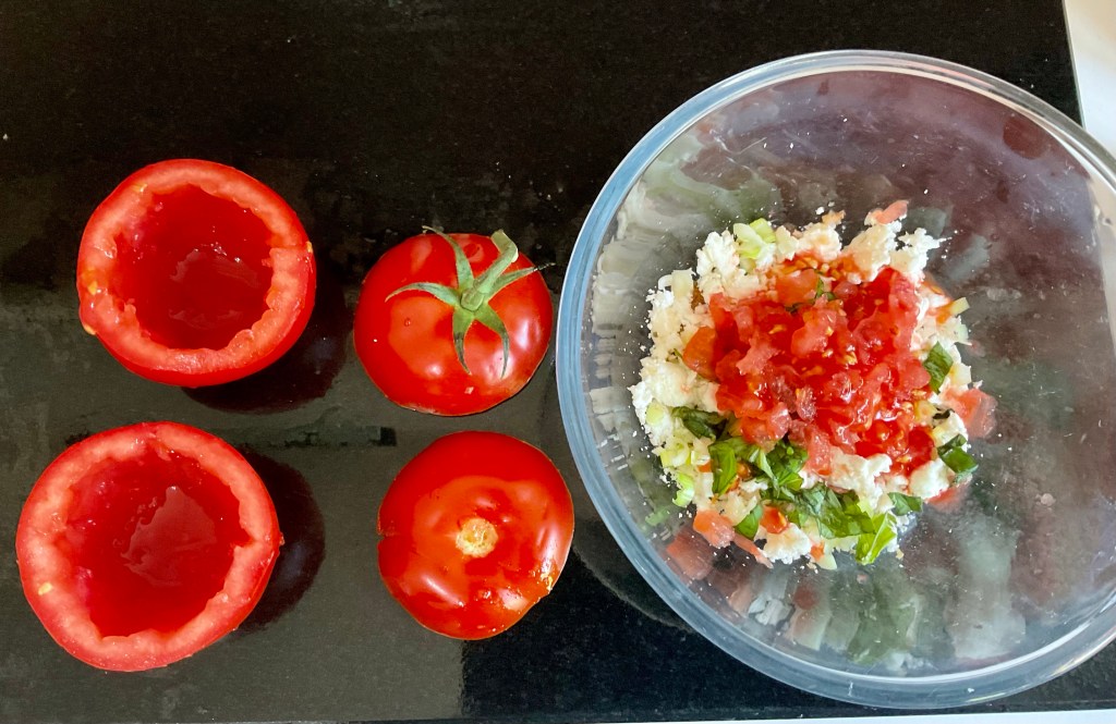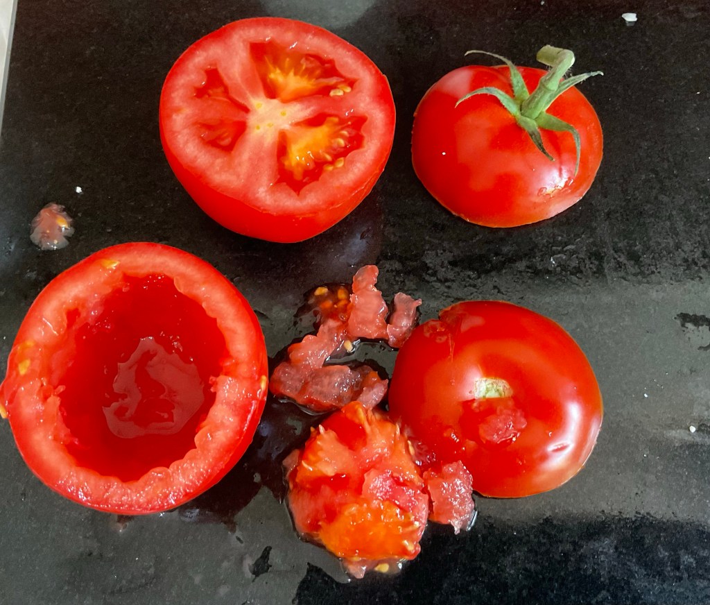 - Carefully slice the tops of the tomatoes off to form lids. Using a teaspoon scoop out the insides of the tomatoes. Remove the white stems but chop the rest of the flesh.