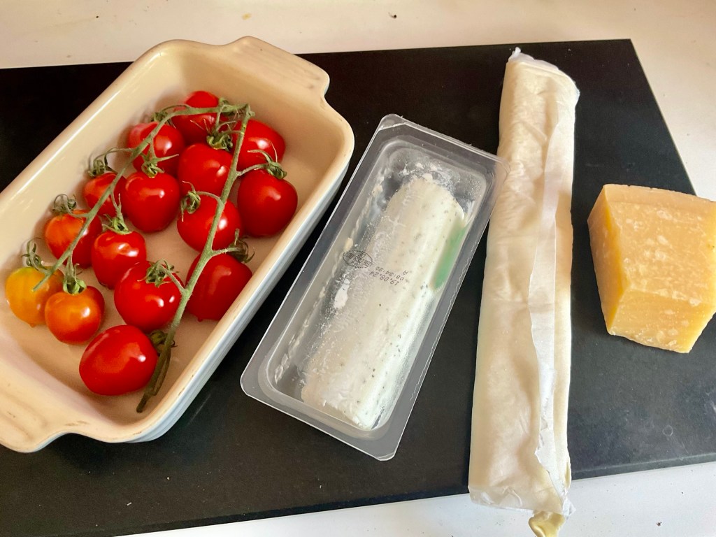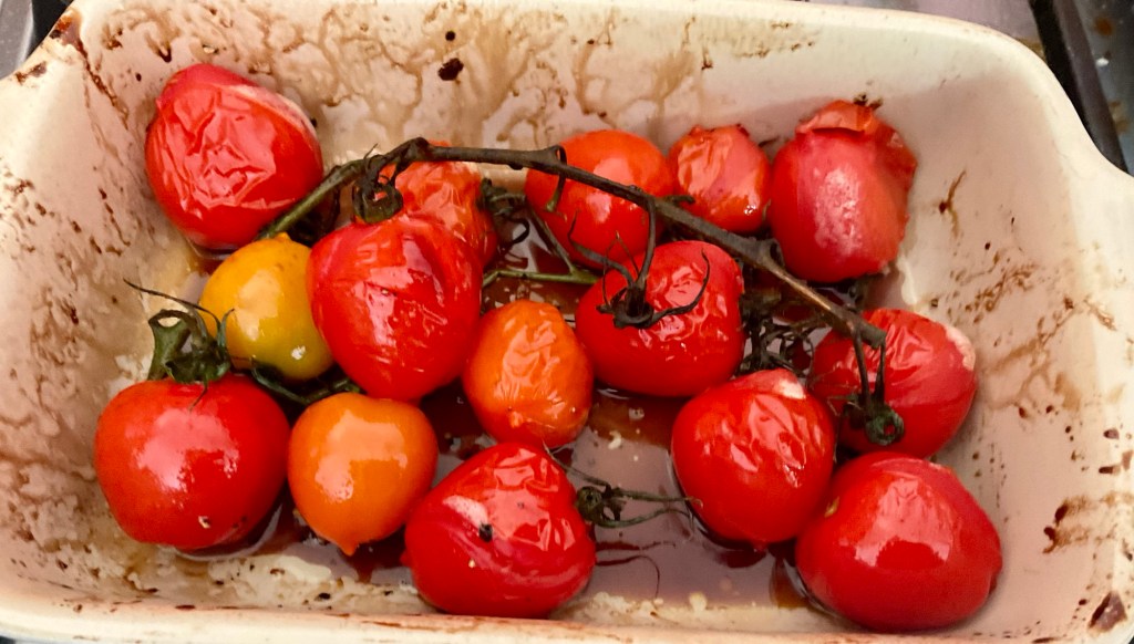 - Pre heat oven to 200 degrees. In a baking tray add the tomatoes, olive oi, balsamic vinegar and season with salt and pepper. Give it all as toss and bake for 5 minutes until the tomatoes start to blister and soften a little. Leave the oven on and set aside.
