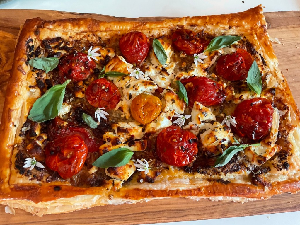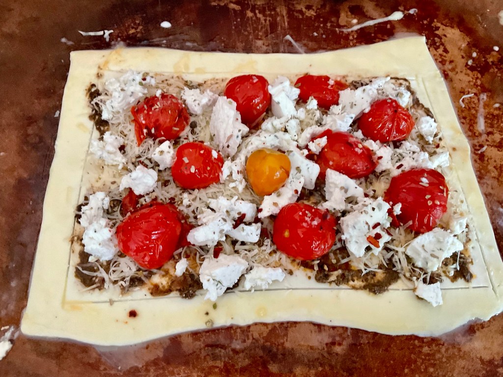 - Assemble the tart by spreading the tapenade or pesto in the inner rectangle. Evenly sprinkle of the parmesan. Add the roasted tomatoe. Tear over the goats cheese. Finish off with a good pinch of the red pepper flakes, oregano.