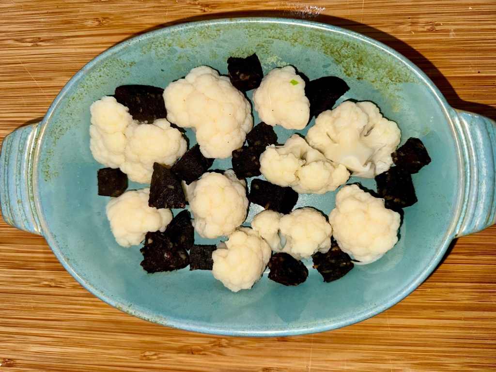 - If using the black pudding. Pop it in the air fryer and cook for 10 mins until it goes crispy. You can use the grill or a frying pan too 5 minutes each side. Once cooked put in the oven dish with the cauliflower.