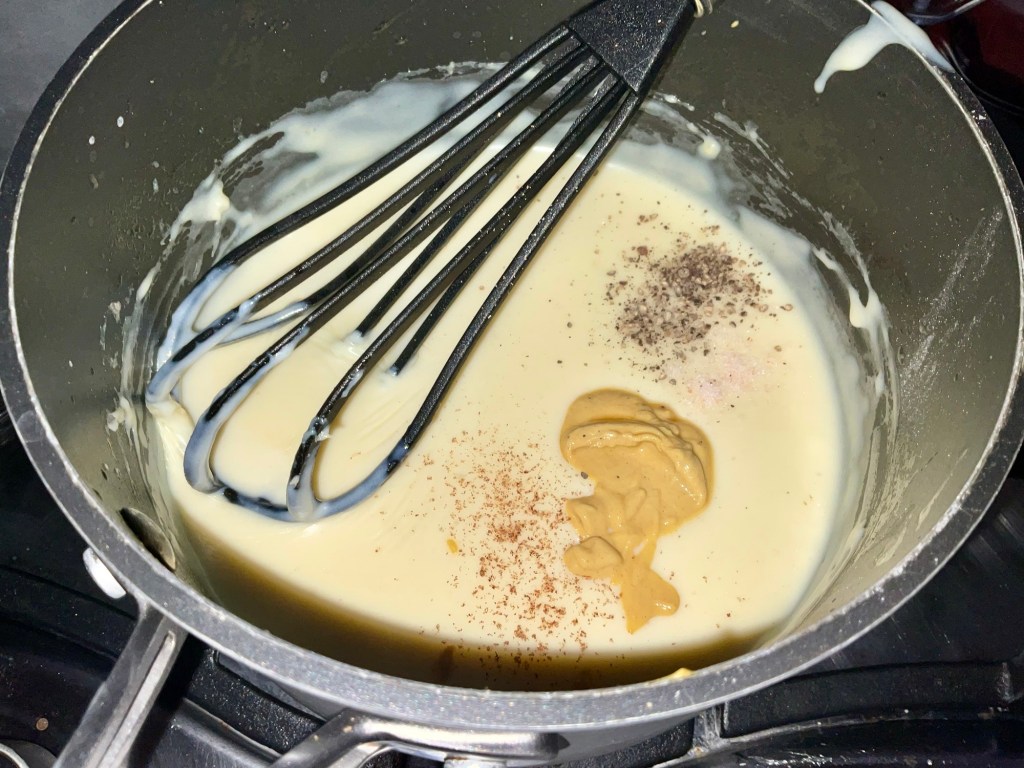 - To make the cheese sauce. Melt 2 tbsp butter in a pan until it starts to foam. Add the flour and give a good mix with a wooden spoon to form a roux. Cook the flour out for a few minutes but don’t let it burn (keep it moving around). Add the milk (I add mine all at once and I whisk it and all the lumps disappear when it gets hot. Take the pan off the heat when the sauce starts to bubble. Stir in the cheese until melted. Finallystir in the mustard, nutmeg and season to taste. Pour evenly over the black pudding and cauliflower.