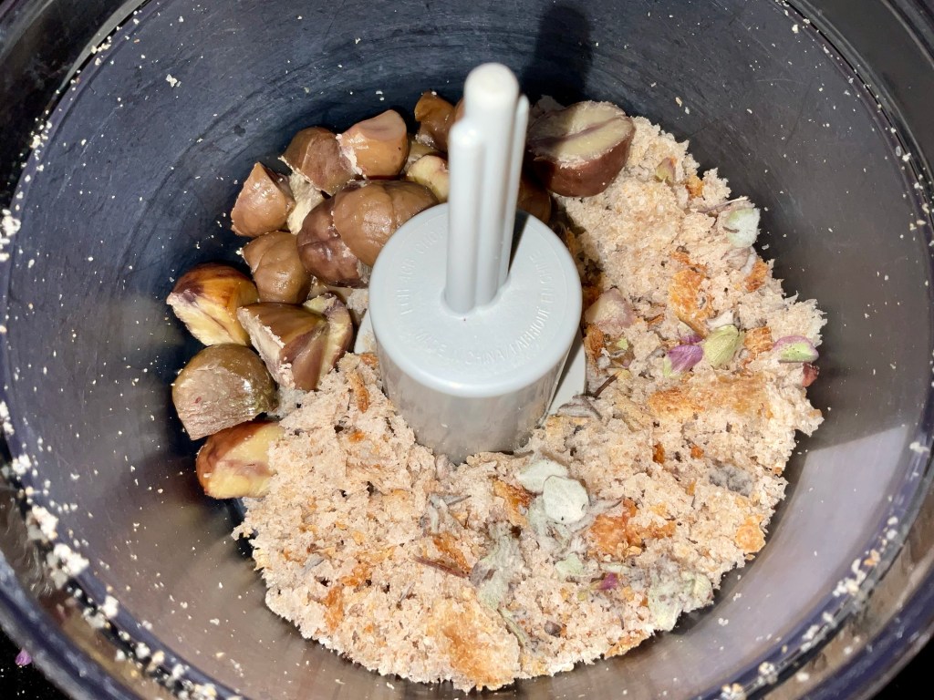 - In a food processor tear in the bread, add the chestnuts, sage oil and salt. Pulse until you get course breadcrumbs.