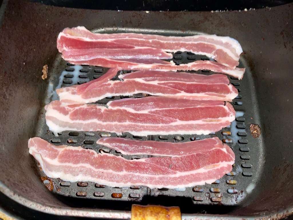 - Put the streaky bacon in the air fryer (or grill if your using) and cook at 200 degrees for 15-20 minutes checking every 5 minutes remove and drain on kitchen paper.