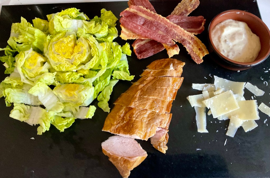 - Assemble the salad by adding the sliced gem between 2 bowls. Add the chicken slices. Break up the bacon pieces and add them along with croutons. Finish off with the anchovies, parmesan shavings and dressing. Enjoy. 😊