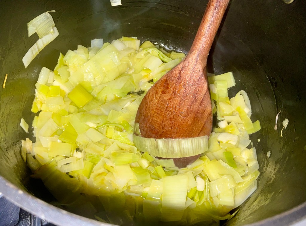 - In a stock pot that has lid add the butter and oil (the oil stops the butter burning). Add the leeks, turn the heat down to medium high. Pop the lead on a sweat them stirring occasionally for 10 minutes or until they are nice and soft. Add the Garlic and cook for a further minute.