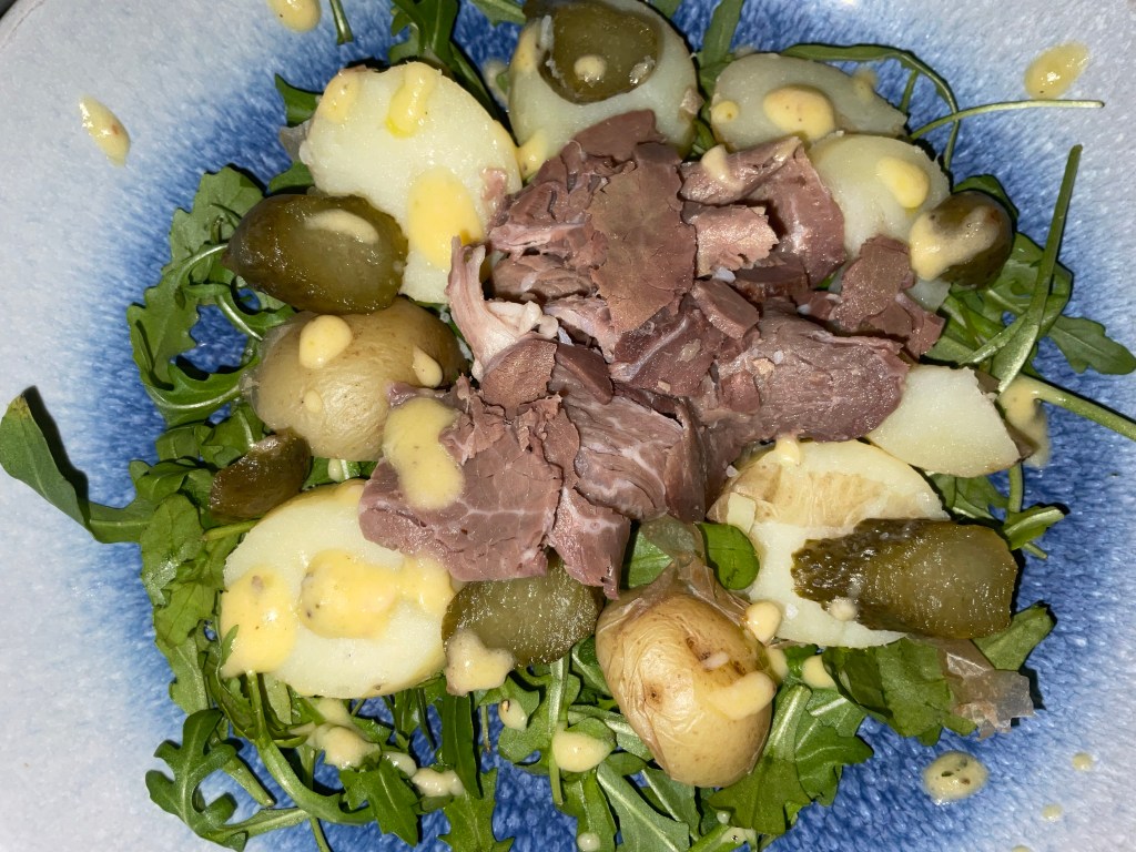 - Layer up the salad by adding the rocket, sliced potatoes, gherkins and beef to a bowl. Drizzle over the dressing. Enjoy 😊
