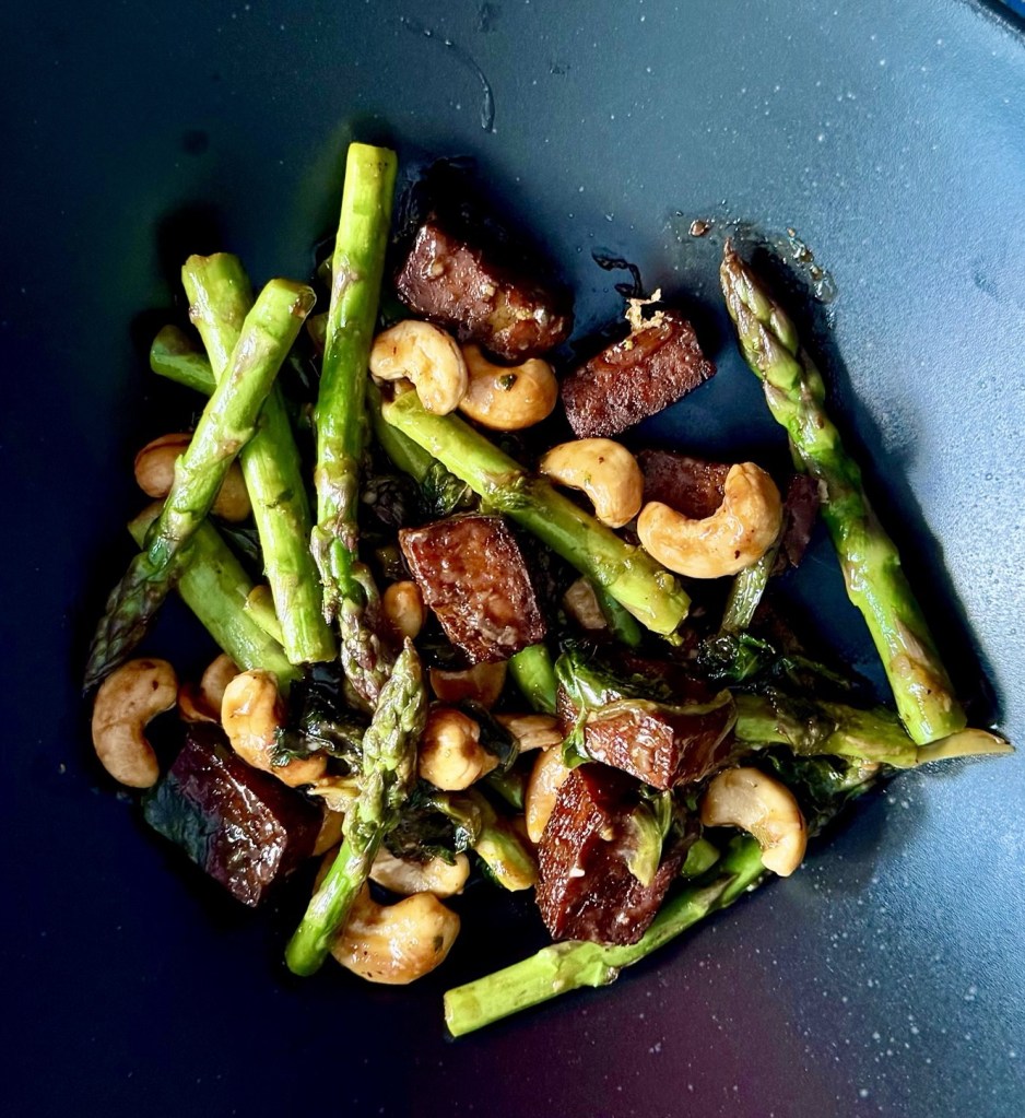 This is such a comforting dish and I know it sounds strange but really inoffensive The reason I say that is there it isn’t too spicy or salty it just has really delicious familiar flavours like you get from your take away. Its been elevated into a special dish purely by the ingredients. I love cashew nuts and I find adding them to stir fry’s adds a luxurious feeling and creamy nutty taste along with some crunch. We also have asparagus in season right now and there is only a small window April – June where I can by them off a local farm fresh that morning. I find using seasonal produce makes the flavours so enhanced and concentrated. It also makes me that time of year exciting and special knowing it won’t be until next year I get them again. It also pushes me out of my comfort zone by trying to use them in different dishes while they are in abundance.