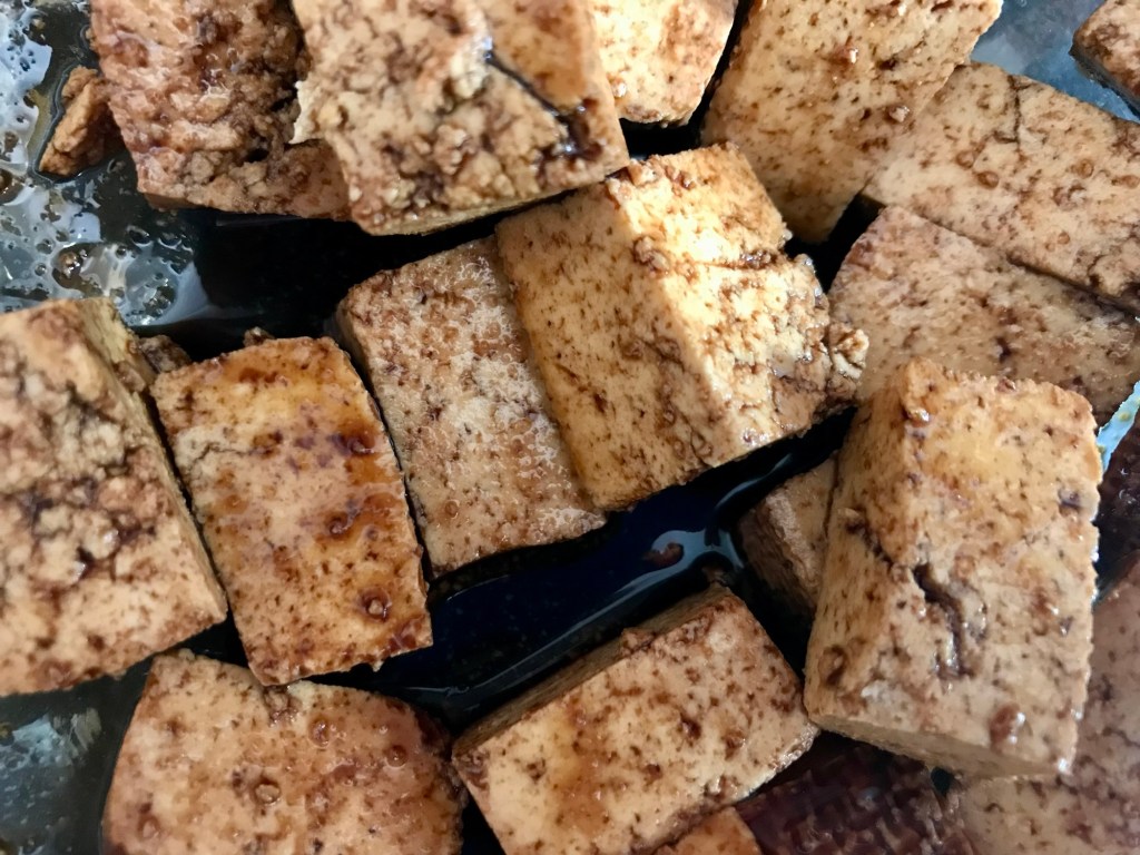 - Cut the tofu into cubes. In a bowl add the soy sauce and kecap manis. Add the tofu and give it a mix (lightly so it the tofu doesn’t break) until each piece is coated. Cover and pop in the fridge for at least 30 minutes. Leave it as long as you can as tofu really soaks up flavour beautifully. I try to do mine the night before or in the morning.