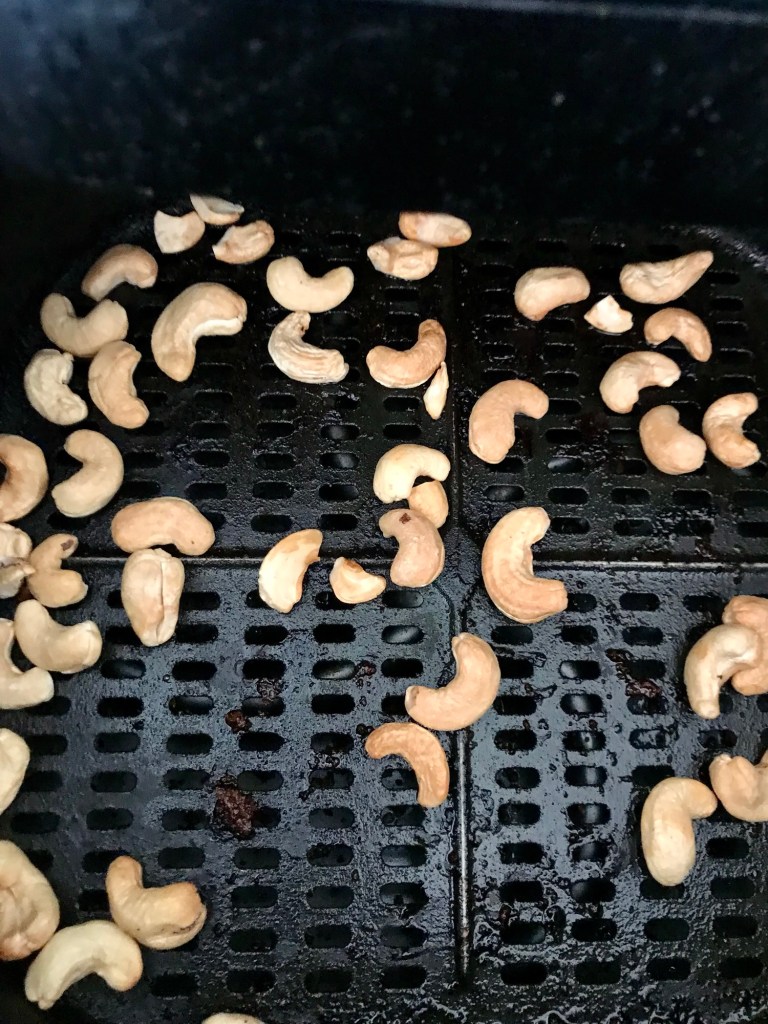 - If you are using unroasted cashew nuts, pop them in the air fryer or fan oven at 190 degrees for 2 minutes shaking half way through. Set aside.