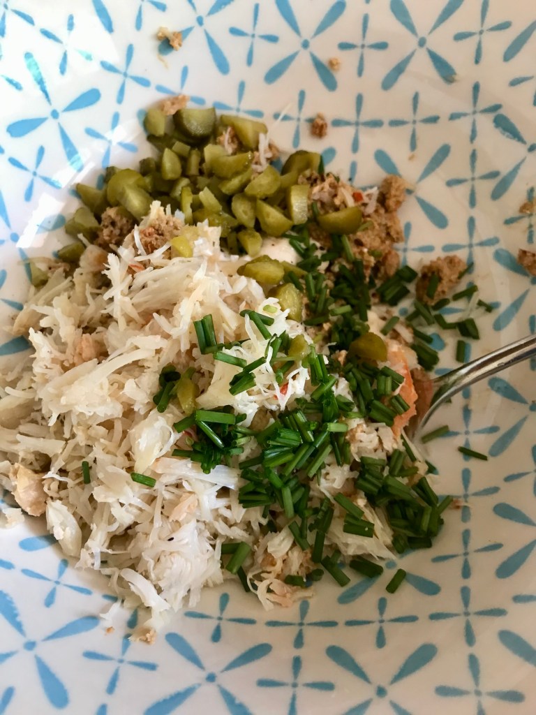 - To make the crab filling, add all of the ingredients apart from the lettuce leaves or avocado into a bowl. Using a fork lightly fold all the ingredients trying not to break up the white crabmeat too much.