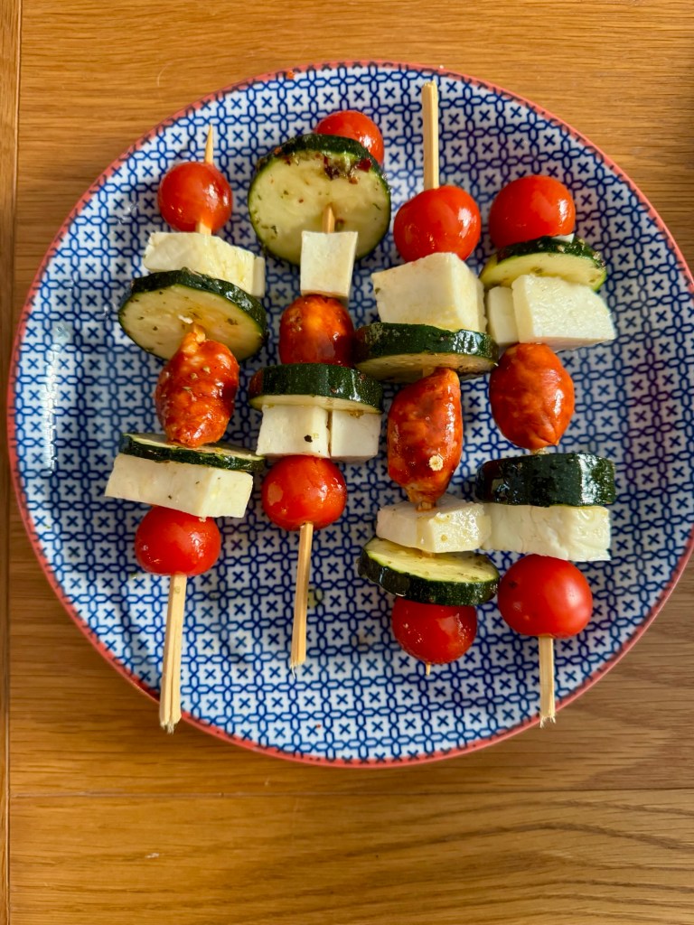 - Assemble the skewers by first adding a tomato. A chunk of halloumi. Dip the courgette in the marinade thread onto the skewer. Dip a whole chorizo in the marinade add to the skewer. Then add another halloumi chunk, marinated courgette and tomato. Repeat with the rest of the skewers.