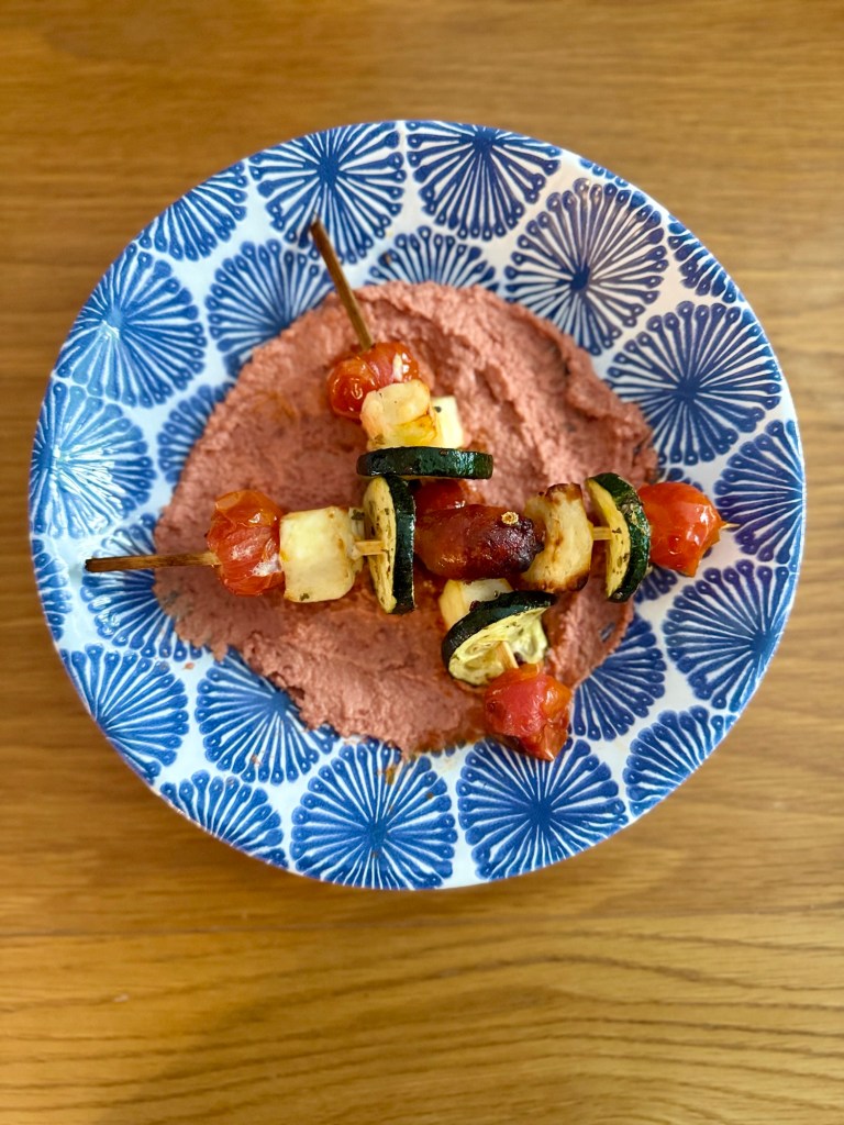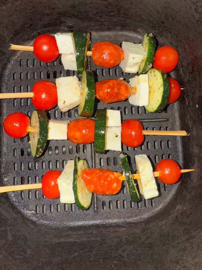I love my air fryer, I chuck most things in it. It saves electricity and needs minimal oil if any so it keeps it skinny too. I really love the even crisp and browning you get from kale crisps to skewers like this. These are classic Mediterranean flavours they remind me of holidays in the sun sipping wine and people watching. I had some jarred beetroot in the fridge and thought they would add an extra earthy flavour. The colour is awesome too. These would be great as part of a BBQ and a bit different and light for your guests. They look impressive but are really simple to make.