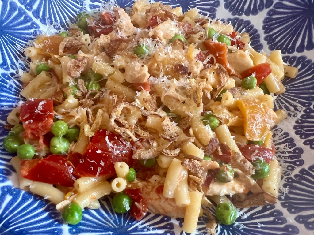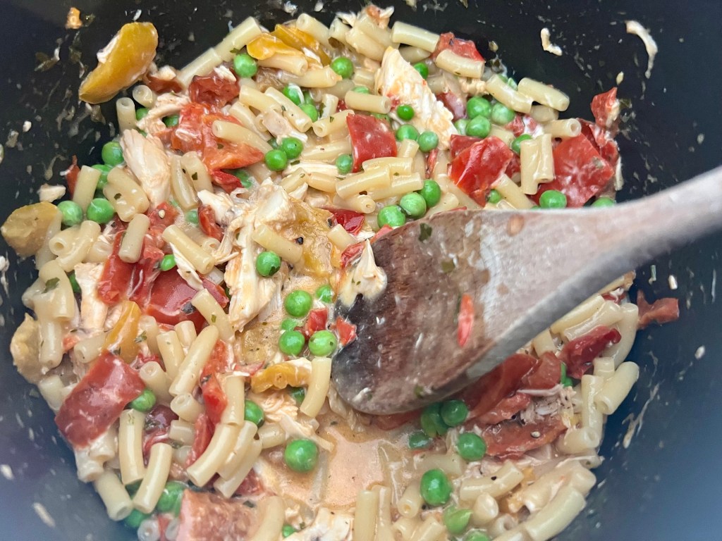 - Add the cooked pasta and the mayonnaise. Give it stir so everything I’d mixed together and warmed through. Check the thickness of the sauce. Add in the reserved pasta water a bit at time until you get the consistency you prefer.